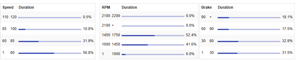 The specific ranges for the Speed, RPM, and Brake are shown to the left and the percentage of drive time spent in each of those ranges can be seen on the right.